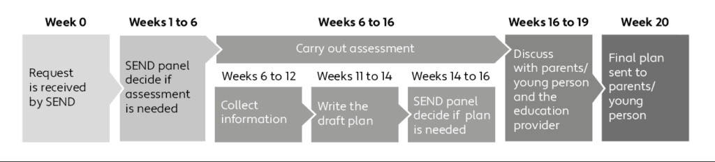 Week 0 – The process begins when the Local Authority (LA) received a request for assessment of a child /young person or the child /young person is brought to the LAs attention.